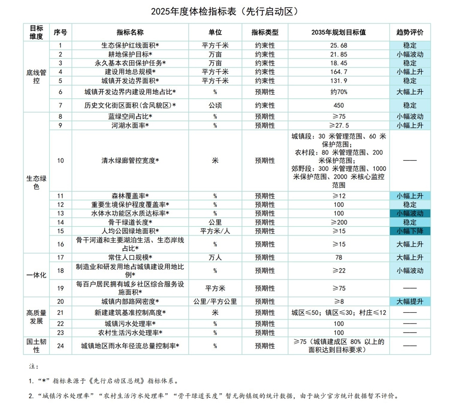 本次体检首次对各项规划控制指标的实施率和变化趋势进行量化评价。“很多控制性和约束性的指标是国土空间规划的重要内容,按照要求必须落实;还有一些是预期性引导性指标,需要监测变化趋势和落实进度。”示范区执委会生态和规划建设部主管何良将介绍,体检报告中,在示范区层面设置40项指标,先行启动区层面设置24项指标,从底线管控、生态绿色、高质量发展、一体化协同、国土韧性五个维度,通过量化数据精准评价指标实现程度。