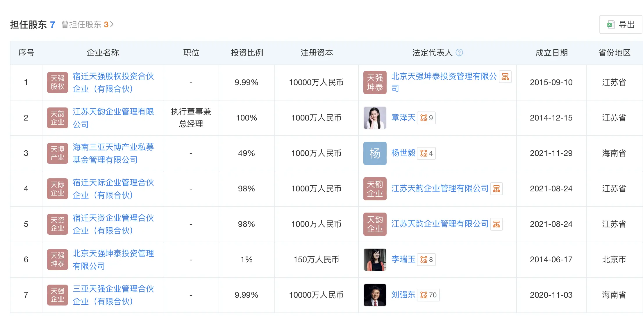 天眼查信息显示,章泽天对宿迁天际、宿迁天资持股比例均为98%,对海南三亚天博私募持股49%,对宿迁天强、持股比例为9.99%。此外,章泽天对江苏天韵企业管理有限公司 100%持股,并担任执行董事兼总经理。